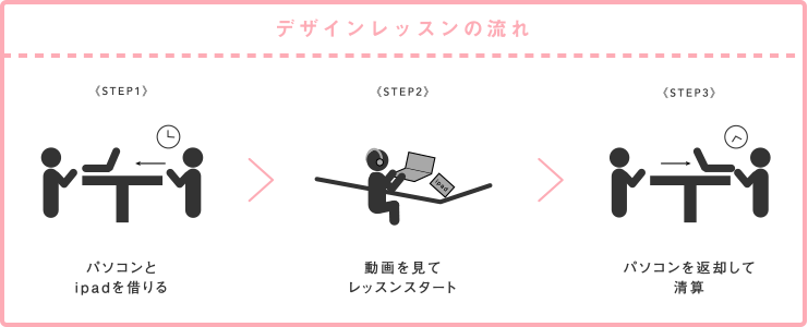 | STEP.5 | デザインレッスンを終わる場合は、片付けをしてからフロントにてご精算をお願いします。 |
